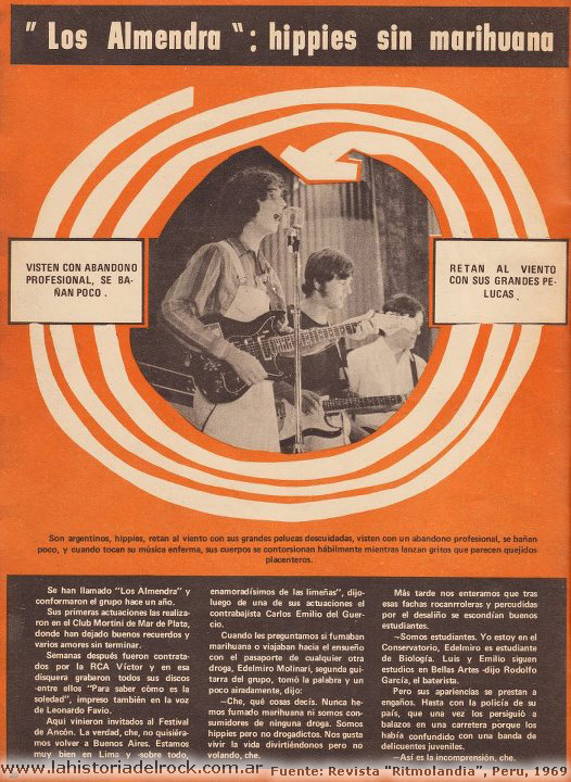 Nace en Febrero de 1968, sus integrantes eran compañeros del colegio secundario e integraban dos bandas por separado, Los Sbirros donde estaban Emilio del Guercio y Molinari y Los Larkins donde estaba Rodolfo García y Spinetta. De la fusión de ambos grupos surge la formación de Almendra. Gracias al productor Ricardo Kleinman, que los ve tocar en un ensayo, les da una prueba para RCA, así llegan a grabar su primer simple, el 20 de octubre de 1968, esto se produce antes de tener presentaciones en vivo. En el verano del 69´se van a trabajar a Mar Del Plata a un boliche llamado "Matoko´s", a su regreso a Buenos Aires graban su primer LP, el que los coloca junto a las grandes bandas del comienzo de nuestro rock en ese momento, "Manal" y "Los Gatos". Entre Abril y septiembre de 1969 graban su primer LP que es editado el 15/10/69 con temas inmortales como "Muchacha ojos de papel" y "Ana no duerme" entre otros, que les dan amplia difusión. Su álbum doble de 1970 y las interminables series de shows, marcan el final de la banda que se disuelve a fines de 1970, contribuyó a esto los proyectos de Spinetta que no incluían al grupo y el desgaste en la amistad de sus integrantes. Durante diciembre de 1979 se produce el retorno de Almendra a los escenarios, la idea surgió por iniciativa Alberto Ohanian, editor de la revista Expreso Imaginario, y rápidamente prendió en los integrantes del grupo. La enorme expectativa y apoyo del público los lleva a realizar 6 recitales en el estadio "Obras" convocando a 25.000 personas y dos funciones mas en el Lawn tenis club, para culminar con shows en varias ciudades del interior. Al año siguiente se edita un disco doble en vivo grabado en los recitales del estadio Obras, que recoge toda la magia de esas noches. 1980 traería todavía mas, Spinetta y compañía entregan a sus fans un nuevo y excelente disco de estudio llamado "El Valle Interior", editado por su propio sello independiente, que también es presentado en una gira por el interior del país, poniendo punto final a la historia de la banda. El 4 de diciembre de 2009, en un concierto multitudinario realizado en el estadio de Velez, Luís Alberto Spinetta reunió a todas sus bandas, en esta ocasión Almendra interpretó varias de sus canciones más emblemáticas. Spinetta fallece en la ciudad de Buenos Aires el 8 de febrero de 2012. |