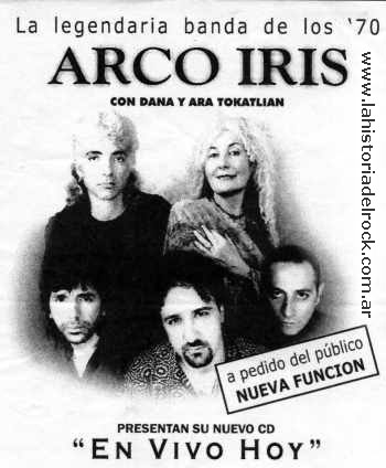 Su historia arranca con el liderazgo de Gustavo Santaolalla haciendo temas en ingles, etapa que abandonarían al grabar su primer simple en mayo de 1969, ese mismo año conoce a la "Instructora Espiritual" Dana, quien encamina de aquí en mas su carrera. En el verano de 1970 ganan el "Festival Beat de la Canción Internacional" en la ciudad de Mar del Plata, con el tema "Blues de Dana", más adelante participan en BArock I. Para 1971 se incorpora Horacio Gianello en la batería. En 1972 Arco Iris edita su opera "Sudamérica o el regreso a la aurora" un disco doble y uno de los trabajos mas importantes en la historia del grupo, prolijamente presentado en un excelente sobre, la banda mostraba con su música un profundo trabajo de fusión con ritmos folklóricos. El día 23 de diciembre de 1972 presentan Sudamérica en el estadio del club River Plate ante 12.000 personas, convirtiéndose en el primer grupo en tocar en ese lugar, que se convertiría a partir de los 90` en el máximo escenario para los grupos mas importantes del rock Argentino. Luego de varios álbumes editados Santaolalla junto con Gianello, dejan la banda a mediados de 1975 y el liderazgo de la misma recae en Ara Tokatlian. Aquí comienza la segunda etapa del grupo, ingresan al grupo Ignacio Elizabetsky, Enrique Villafañe en batería y Mario Cortez en teclados, con esta formación graban un simple. En febrero de 1976 se producen nuevos cambios en la banda se van Villafañe y el pianista e ingresan Nicky Mitchell en batería y Diego Rapoport en órgano y piano, con esta formación se presentan en mayo de 1976. Con la decisión en firme de emigrar a los Estados Unidos, la banda graba y edita en 1977 "Los Elementales", basado en una obra conceptual sobre los elementos Tierra, Agua, Fuego y Aire, que quedaba claramente expresada en el arte del disco. Radicados en la ciudad de Los Ángeles la banda acentúa su tendencia hacia el jazz moderno, edita varios discos y mantienen una intensa actividad que no les impide realizar esporádicos viajes a Argentina y realizar presentaciones fruto de las cuales se editaría "En vivo hoy", en el año 2001 En Marzo de 2006 Ara Tokatlian difunde una carta donde informa sobre la muerte de Dana sucedida en septiembre de 2003 y dada a conocer recién en el 2006. En un fragmento de la carta Ara escribe: "A pesar de nuestros jóvenes 19 años, nadie nos torció el brazo para seguirla. La falta de respuestas de la sociedad, la iglesia y nuestras familias a preguntas e inquietudes internas, hizo que nos acercáramos a Danais... Dondequiera que estés Danais, te hago llegar mi más profundo sentimiento de amor y te agradezco para siempre el haberme invitado a compartir tu vida." |